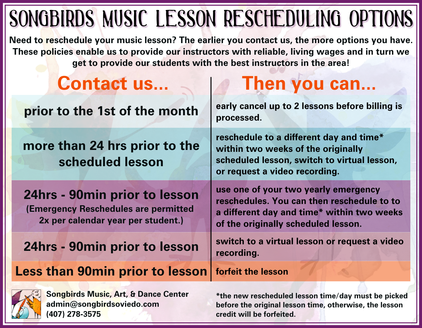 By requiring 30 days’ notice, we’re able to give our instructors stability and respect for their work while also allowing time to find another student to fill the spot. This notice period also gives teachers time to adjust their finances and schedules in case the spot remains unfilled. This policy helps us take care of the amazing teachers who make Songbirds such a special place to learn and grow.